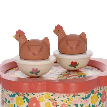 Une fois le mécanisme enclenché, regardez les petites figurines tourner ensemble comme dans une danse. Les deux poules s’animent et prennent vie en chanson pour tournoyer et virevolter sur la musique de la berceuse. Attention qu’elles ne s’envolent pas !