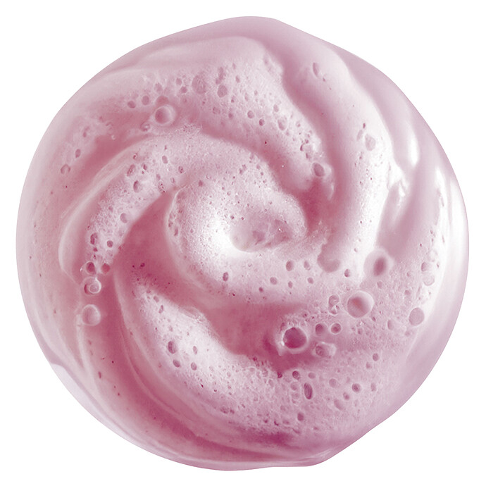Mousse de douche parfum fraise. Une texture chantilly, colorée en rose, onctueuse & douce, testée dermatologiquement et délicieusement parfumée.