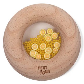 A l’intérieur, votre bébé pourra regarder les petites billes colorées ainsi que les petits morceaux de Citrons. Il pourra également le mordiller grâce à sa fabrication en bois de Hêtre.